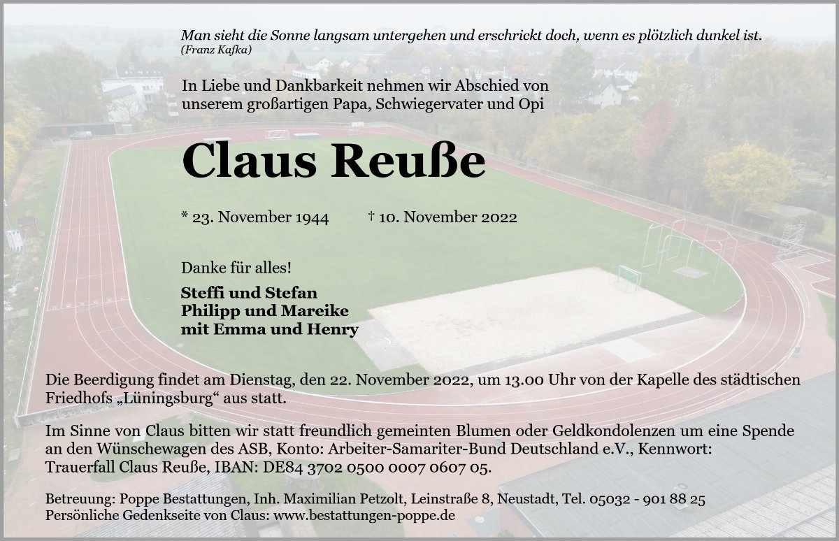 zum Tode Ihres Vaters spreche Ihnen mein tiefstes Mitgefühl aus. Ich habe Ihren Vater durch die Leichtathletik kennengelernt und er war für mich oft ein guter Berater in vielen leichtathletischen Belangen. Ich verbinde Neustadt a. Rbge. immer mit Claus.