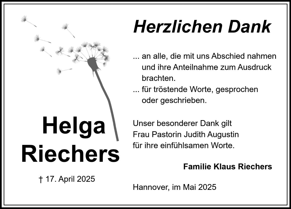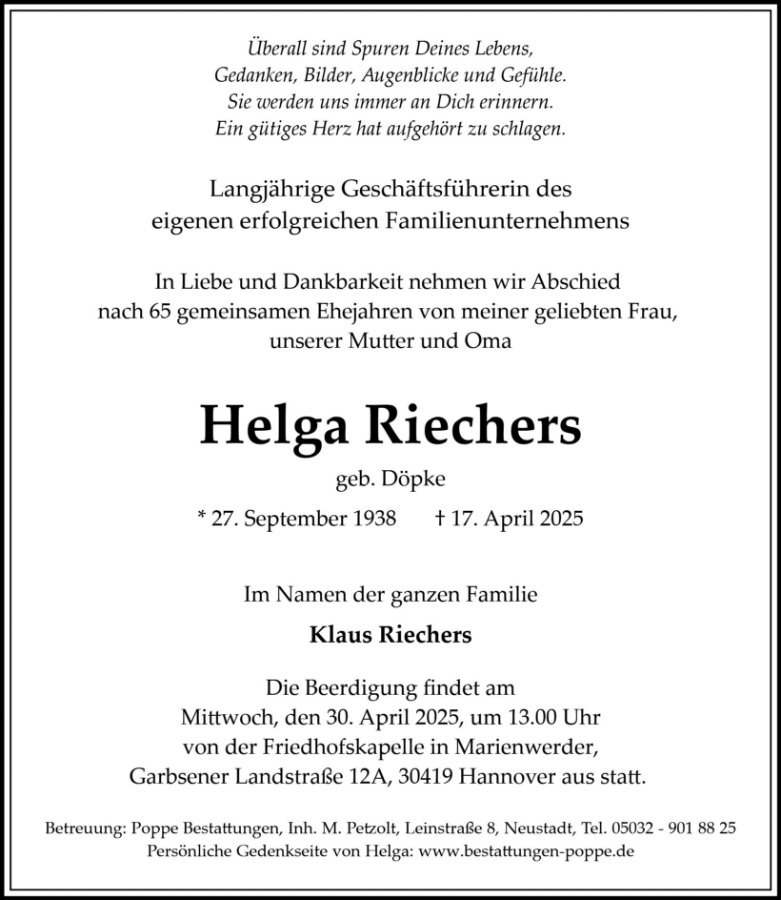 Mit Bestürzung haben wir erfahren, dass nach unseren Eltern nun auch Helga nicht mehr bei uns ist.